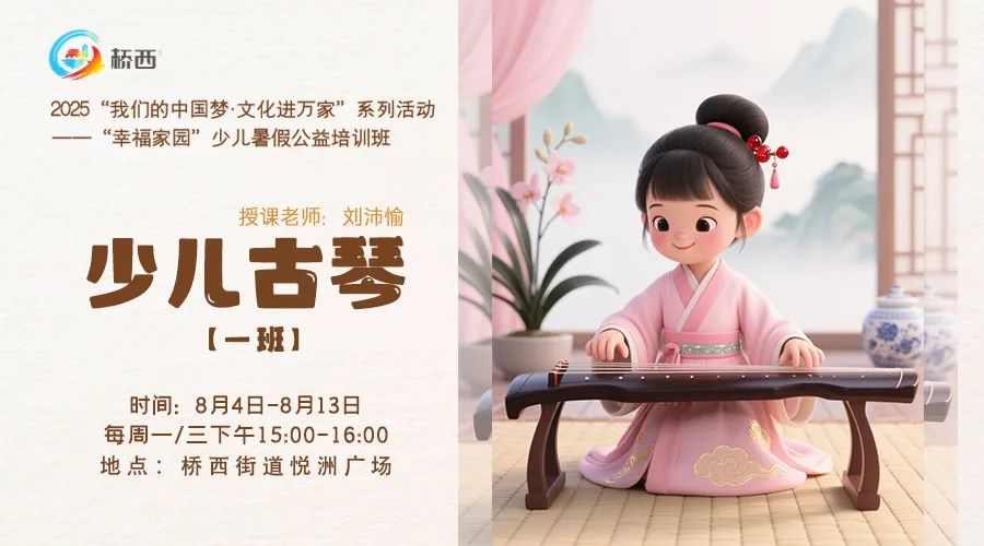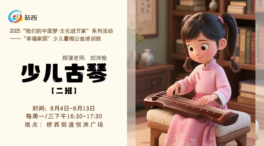 在快节奏的现代生活中,让孩子拥抱传统文化,不仅能滋养心灵,还能点亮暑假时光!今年夏天,桥西街道倾情推出“我们的中国梦·文化进万家”系列活动——“幸福家园”少儿古琴公益培训班。