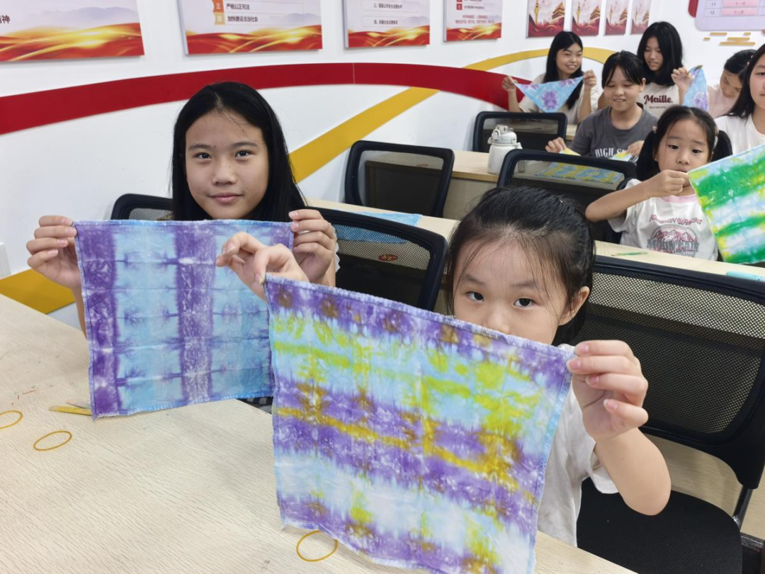 布扎染课堂上,白布在皮筋与染料的魔法下绽放出独一无二的蓝白花纹。