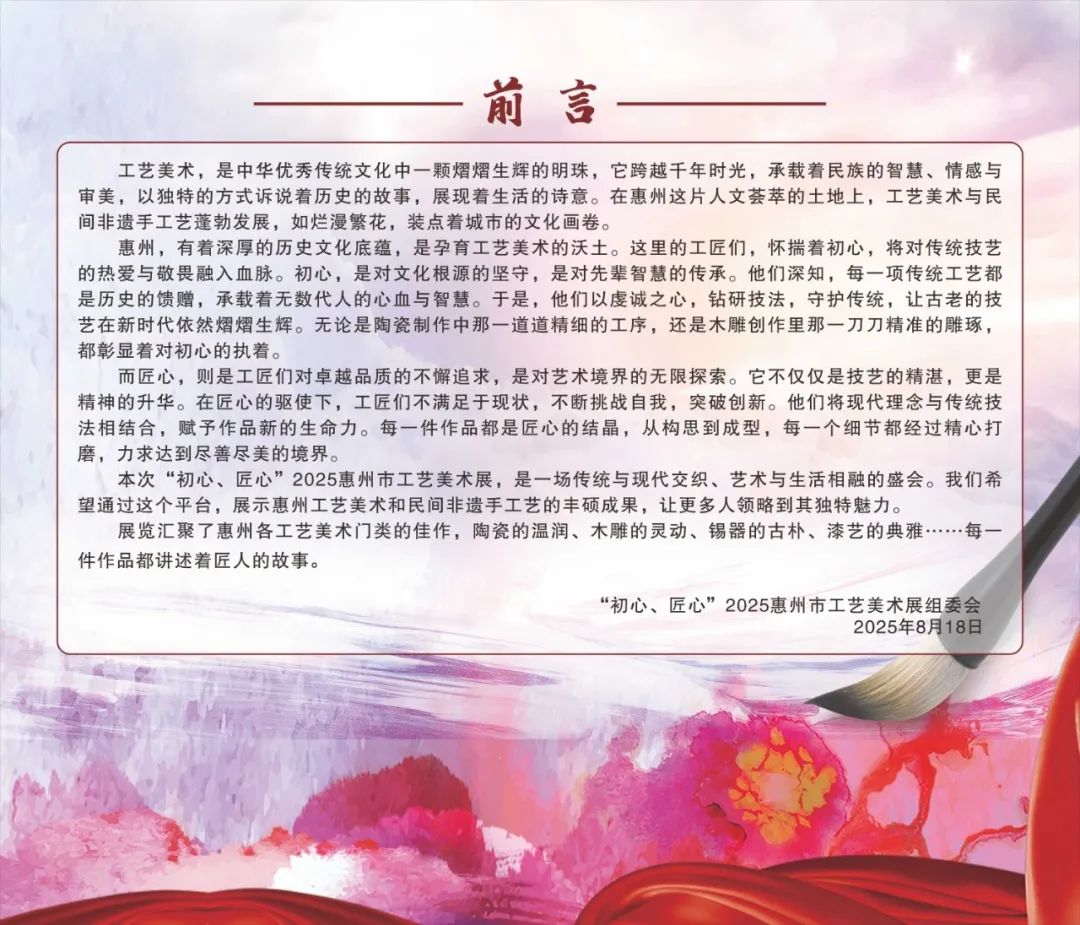 8月18日下午,“初心·匠心”工艺美术展在惠城区文化馆一楼书画展厅正式启幕!此次展览以“初心、匠心”为主题,旨在传承中华优秀传统工艺美术文化,展现惠州工艺美术和民间非遗手工艺的丰硕成果,推动工艺美术与本土文化、现代生活的深度融合。现场人流如织,市民争相感受传统工艺的温度。每日免费开放,静候您的光临。