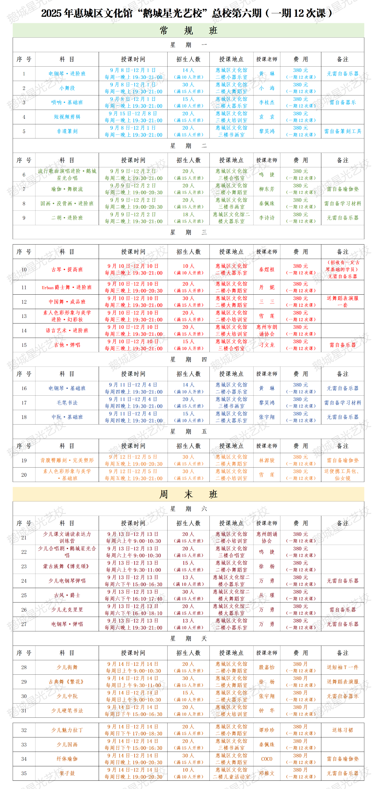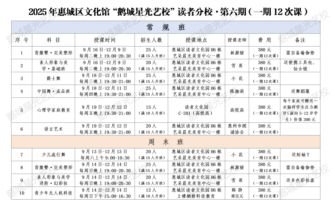 鹅城星光艺校 · 第六期 · 【总校区】课程表