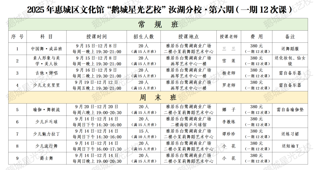 鹅城星光艺校 · 第六期 · 【汝湖】分校课程表