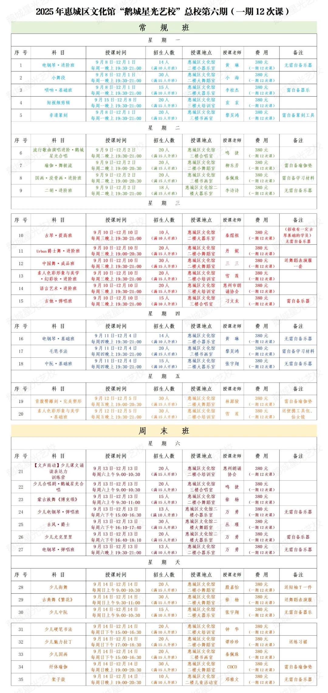 惠城区文化馆 · 鹅城星光艺校 · 第六期 · 【总校区课程表】