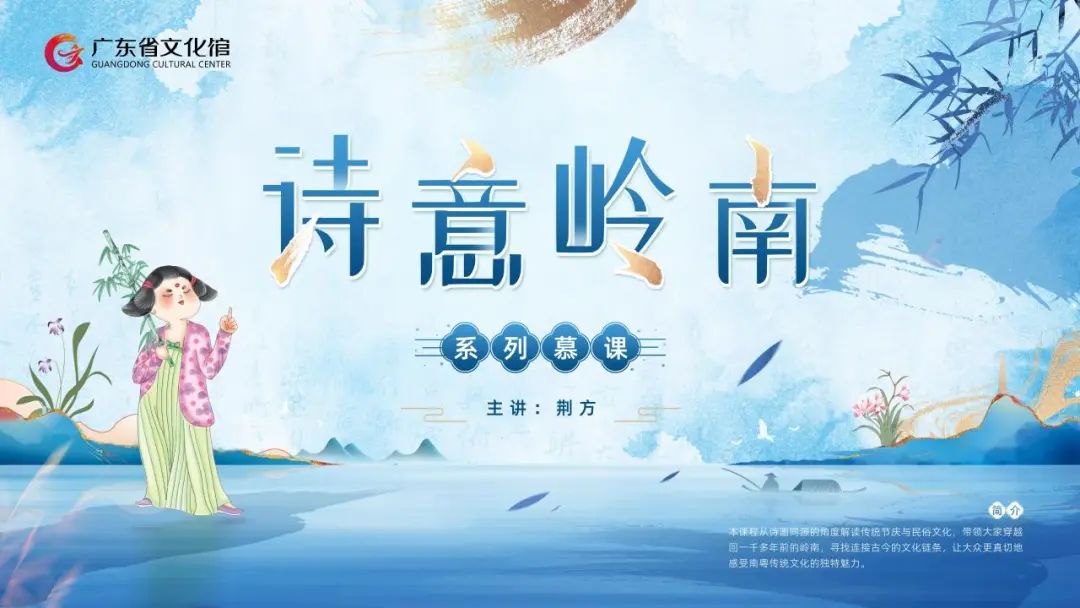 岭南是一片充满“诗意”的土地,她是区仕衡双眼中的“炎方六出尽成花”,是苏东坡唇齿间的“日啖荔枝三百颗”,不朽的诗文记录了岭南的“诗意”。而岭南的“诗意”不止存在于诗文中,还藏在徐徐的碧波和绵绵的细雨里,她在深宫的馆藏中永葆青春,在代代的传承里历久弥新。广东省文化馆邀请作家荆方,打造《诗意岭南》系列慕课,紧密围绕中秋、重阳、春节、元宵等传统节庆,以经典古诗词为线索,从历史、人文、生活美学等角度对岭南非物质文化遗产项目进行解读,让大众更真切地感受非物质文化遗产的独特魅力。