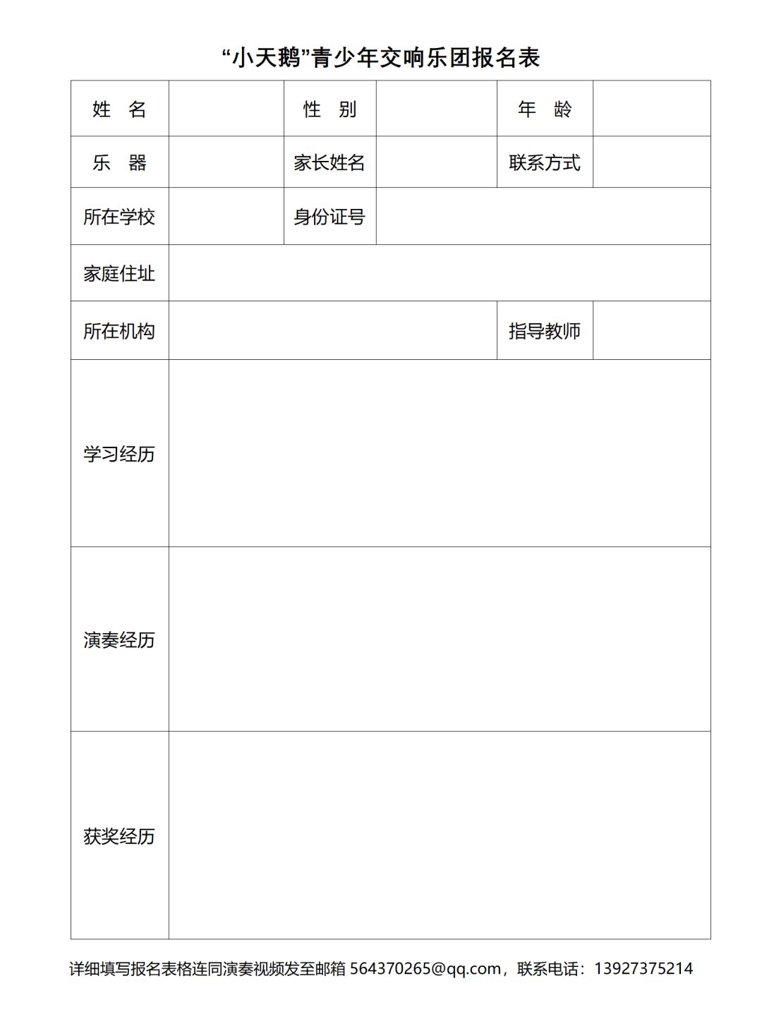 请按要求填写报名表格,电子邮件标题应写明所报声部以及姓名(如:小天鹅—管乐、乐器名—XXX、小天鹅—弦乐、乐器名—XXX、小天鹅—打击乐、乐器名—XXX、小天鹅—零基础、希望学习的乐器名—XXX)。